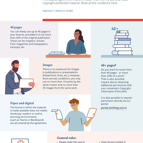 Lecturers at universities affiliated with UNL can reuse up to 40 pages from a work, provided that this does not exceed 20% of the total work. This 'reuse' has been prepaid by your university. This applies to both printed and digital material. The reuse of images in PowerPoint presentations is also covered.