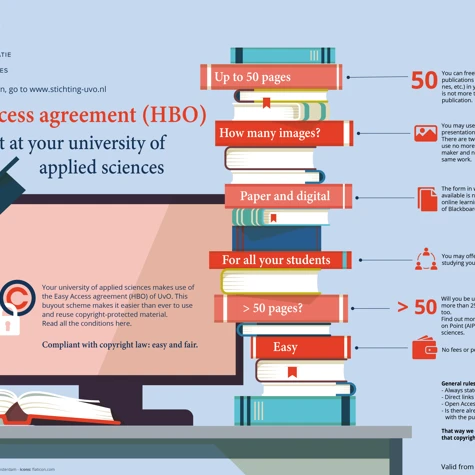 The Dutch Vereniging Hogescholen (VH) has closed a buy out scheme with Stichting UvO on behalf of all their 36 Dutch affiliated universities of applied sciences (UASs): the Easy Access agreement (hbo), for the period 2021-2023, which has been extended to 2024 and 2025. As a result, the reuse of copyrighted material within Dutch universities of applied sciences (UASs) is easier than ever.