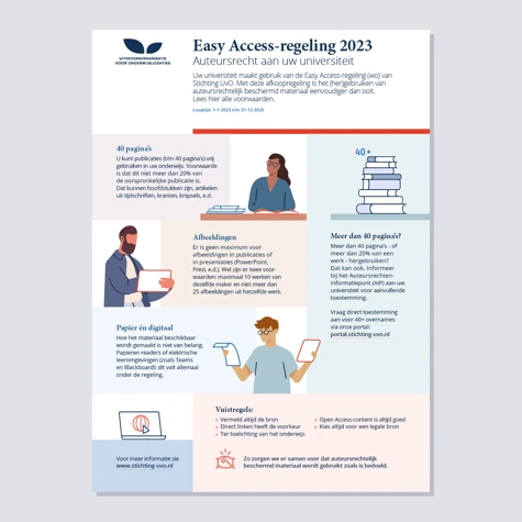 Daarnaast heeft een aantal grotere onderwijsinstellingen een aanvullende Easy Access-afkoopregeling getroffen. Zo mogen de 36 hogescholen van de Vereniging Hogescholen overnames gebruiken tot en met 50 pagina's, mits dat maximaal 25% van het oorspronkelijke werk is. Voor universiteiten aangesloten bij UNL geldt een grens van 40 pagina's en 20% van een werk. De hoogte van deze afkoopsommen hangt samen met studentenaantallen, werkelijk hergebruik en onderhandelingsgesprekken.